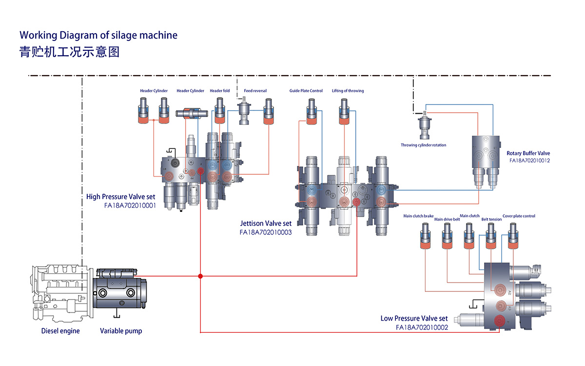 1、根据青储机作业工况,首次提出细分行走驱动模式--路面转场和作业模式。在作业模式时,发动机转速降至1900rpm,行走闭式泵工作在小排量;在路面转场模式时,发动机转速降至1200rpm,行走闭式泵工作在大排量下,极大的降低了噪音和油耗。